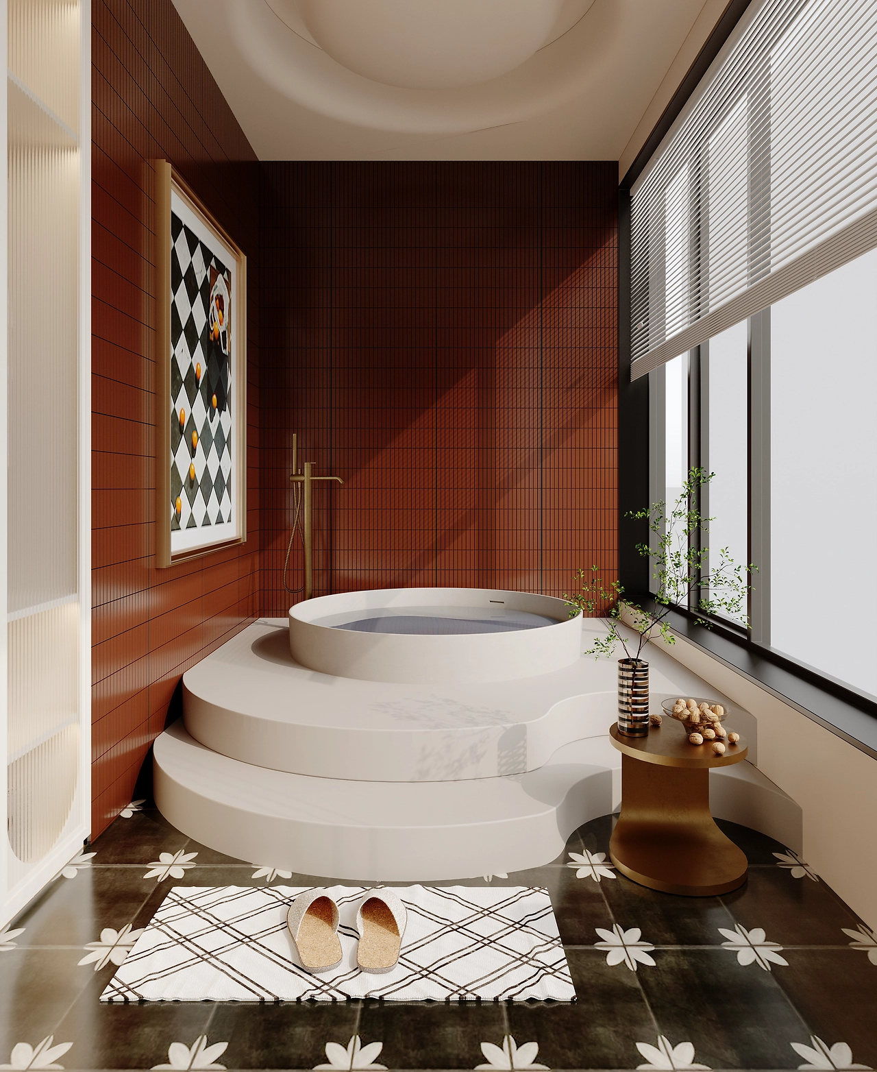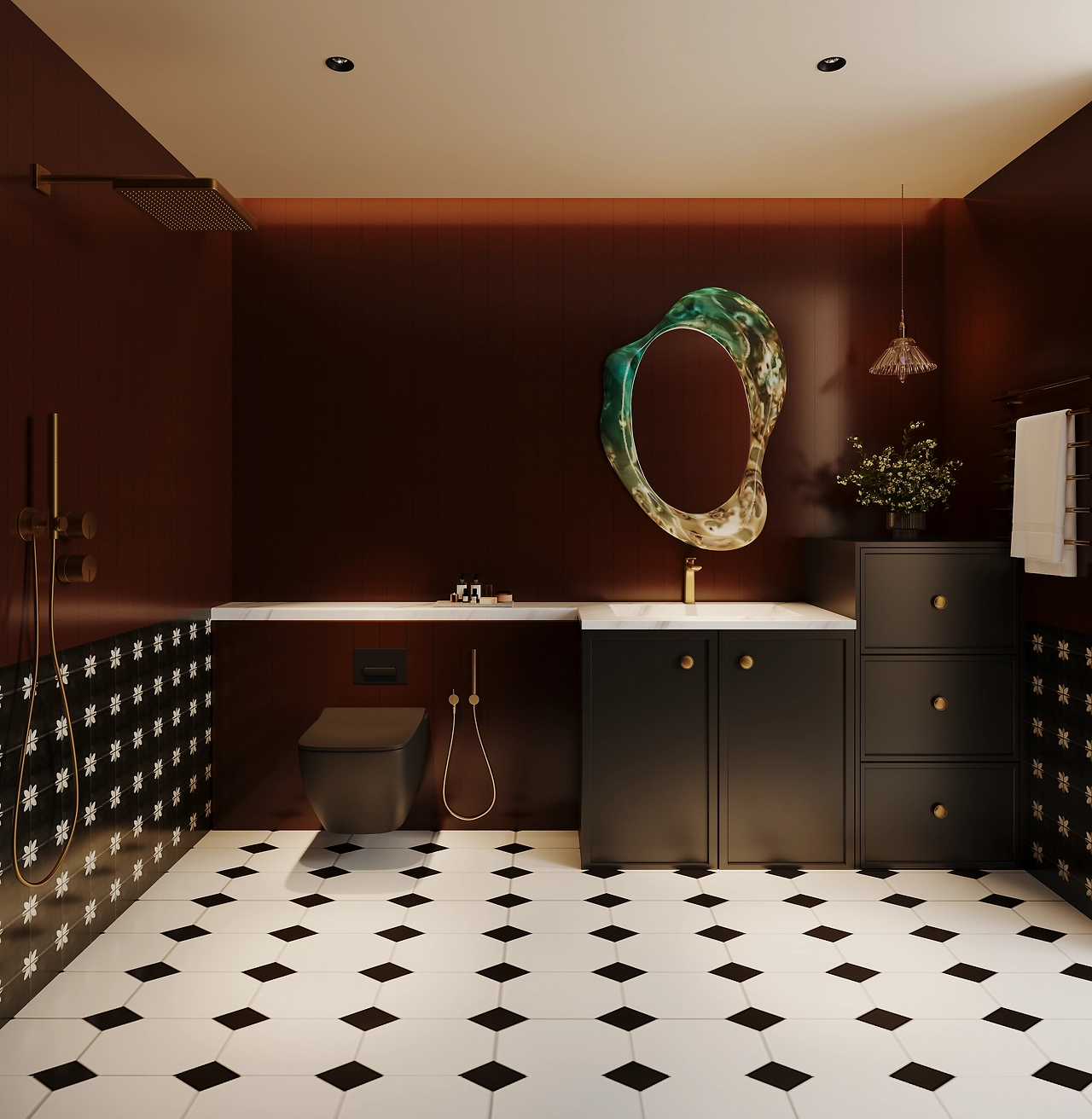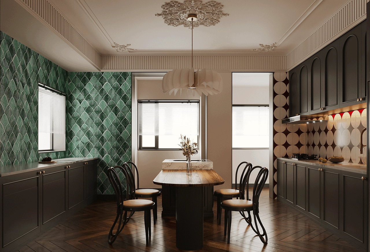 Khu vực bếp ăn được thiết kế với tường gạch xanh lá độc đáo, bàn gỗ tự nhiên và ghế bọc da, cùng hệ thống đèn treo hiện đại, tạo không gian vừa tiện nghi vừa nghệ thuật. Phòng khách với sofa da đen, bàn kính và kệ sách tích hợp thể hiện sự tối giản nhưng đẳng cấp. Phòng tắm ấn tượng với bồn tắm tròn, gạch lát đen trắng và gương nghệ thuật, kết hợp ánh sáng tự nhiên từ cửa sổ lớn.