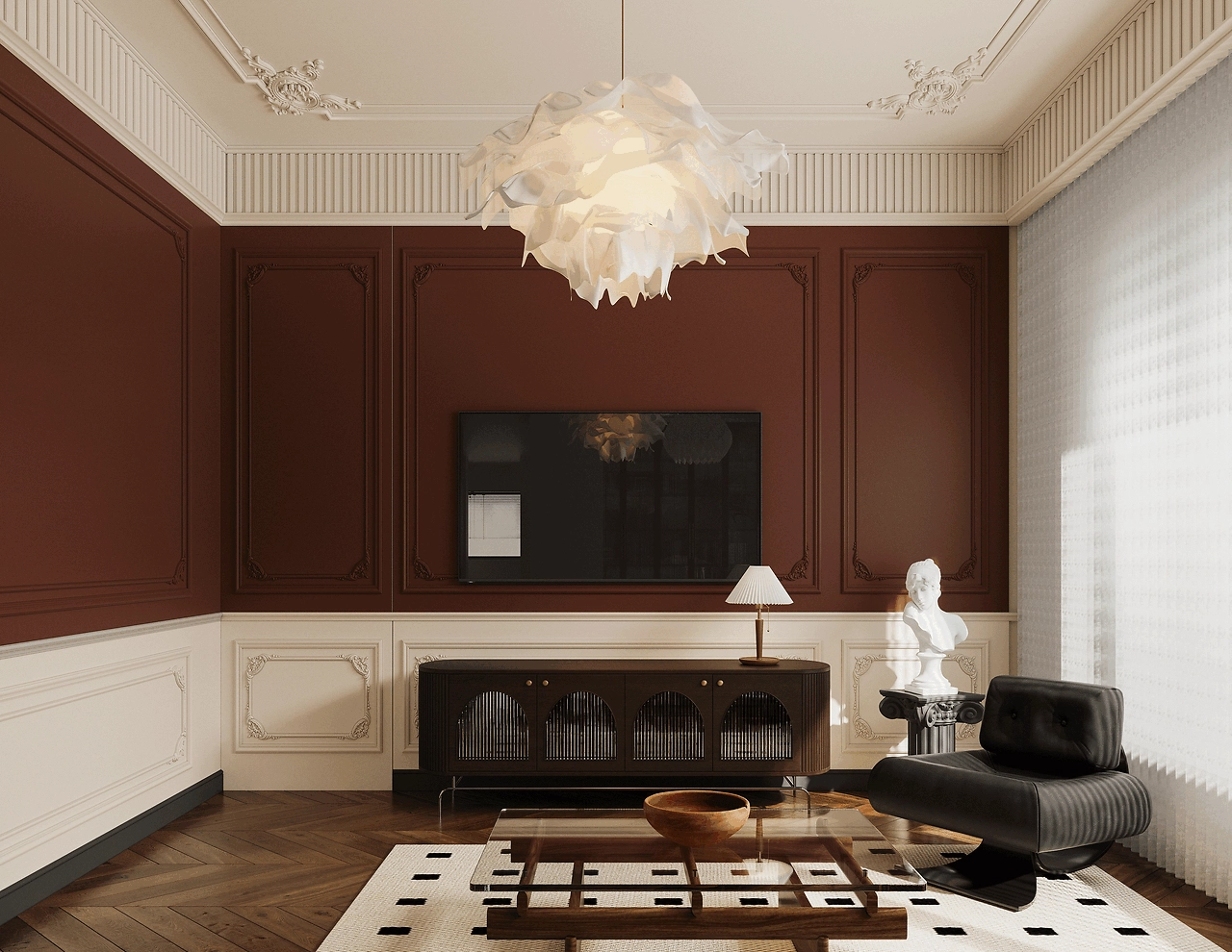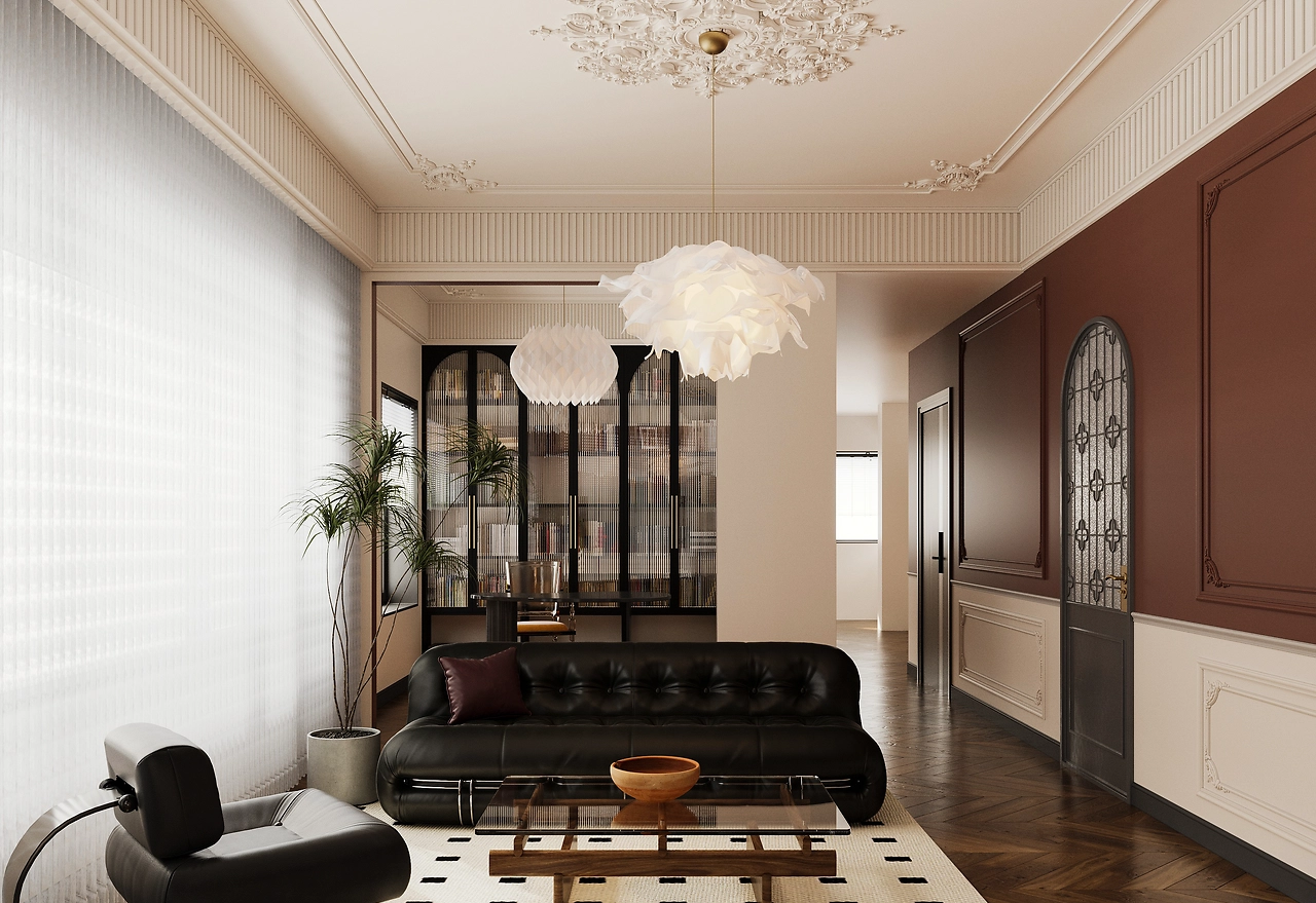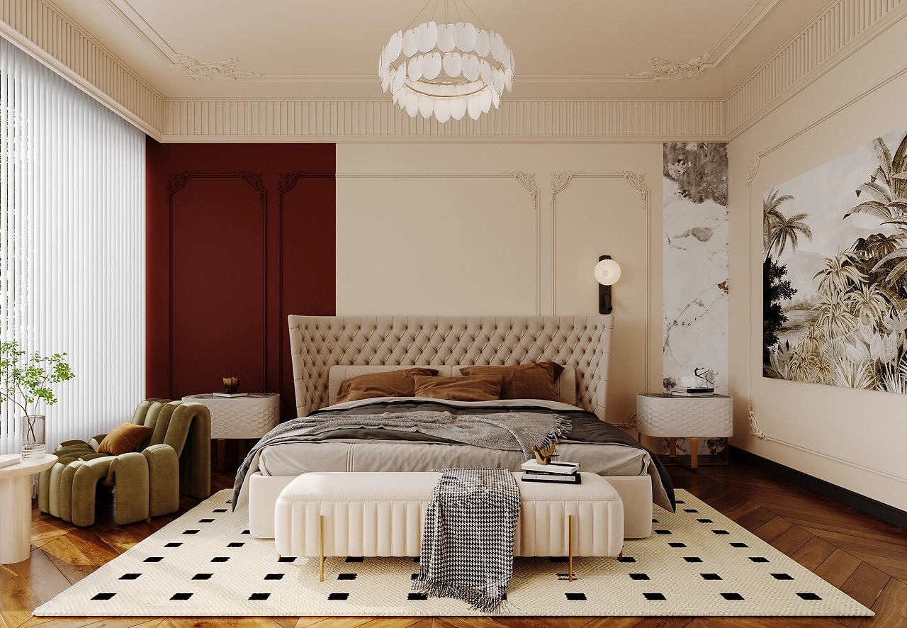 Dự án nội thất căn hộ này là sự kết hợp hoàn hảo giữa phong cách cổ điển và hiện đại, tạo nên một không gian sống sang trọng và ấm cúng. Phòng ngủ chính nổi bật với giường bọc nệm màu be, đầu giường tinh xảo, và đèn chùm trang trí độc đáo, kết hợp cùng tường họa tiết thiên nhiên và ghế bành xanh tạo điểm nhấn sinh động. Sàn gỗ và thảm họa tiết đen trắng mang lại sự ấm áp và hài hòa.