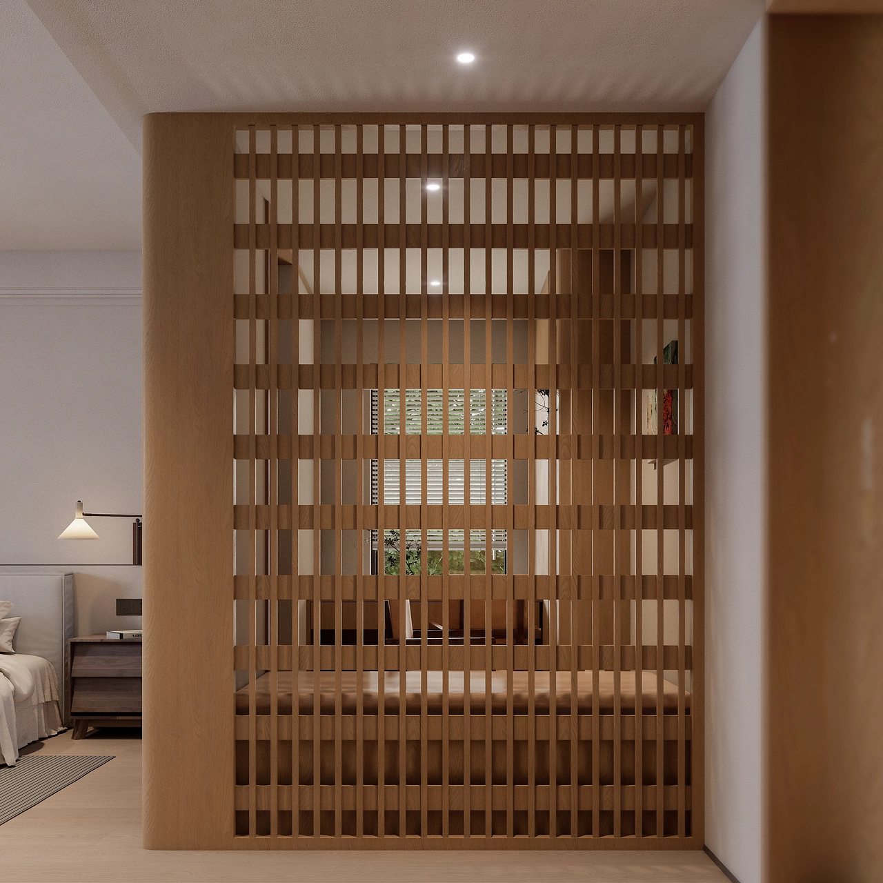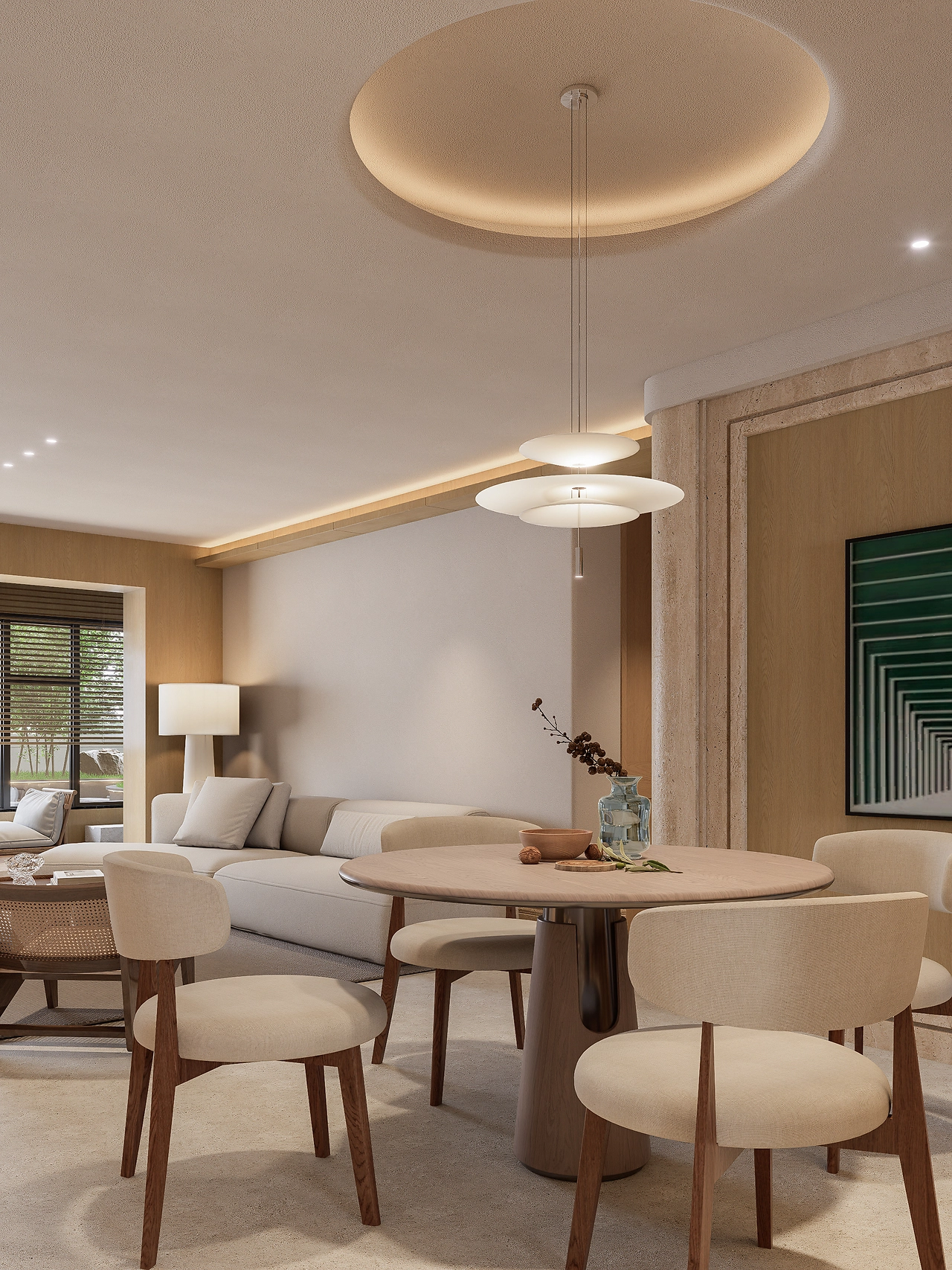Ánh sáng từ đèn trần hiện đại cùng cửa sổ lớn và rèm gỗ mang lại cảm giác thoáng đãng, trong khi khu vực ăn uống với bàn tròn và ghế bọc nệm thể hiện sự tiện nghi. Tường trang trí với tác phẩm nghệ thuật trừu tượng làm tăng thêm nét cá tính cho không gian.