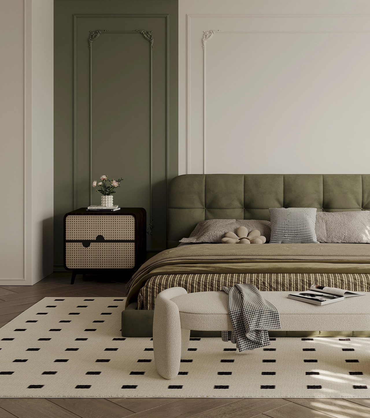 Nội thất mang đến một không gian sống sang trọng và tinh tế, kết hợp hài hòa giữa phong cách hiện đại và truyền thống. Phòng khách nổi bật với bộ sofa màu xanh đậm và be nhạt, tạo điểm nhấn ấm cúng trên thảm họa tiết đen trắng.